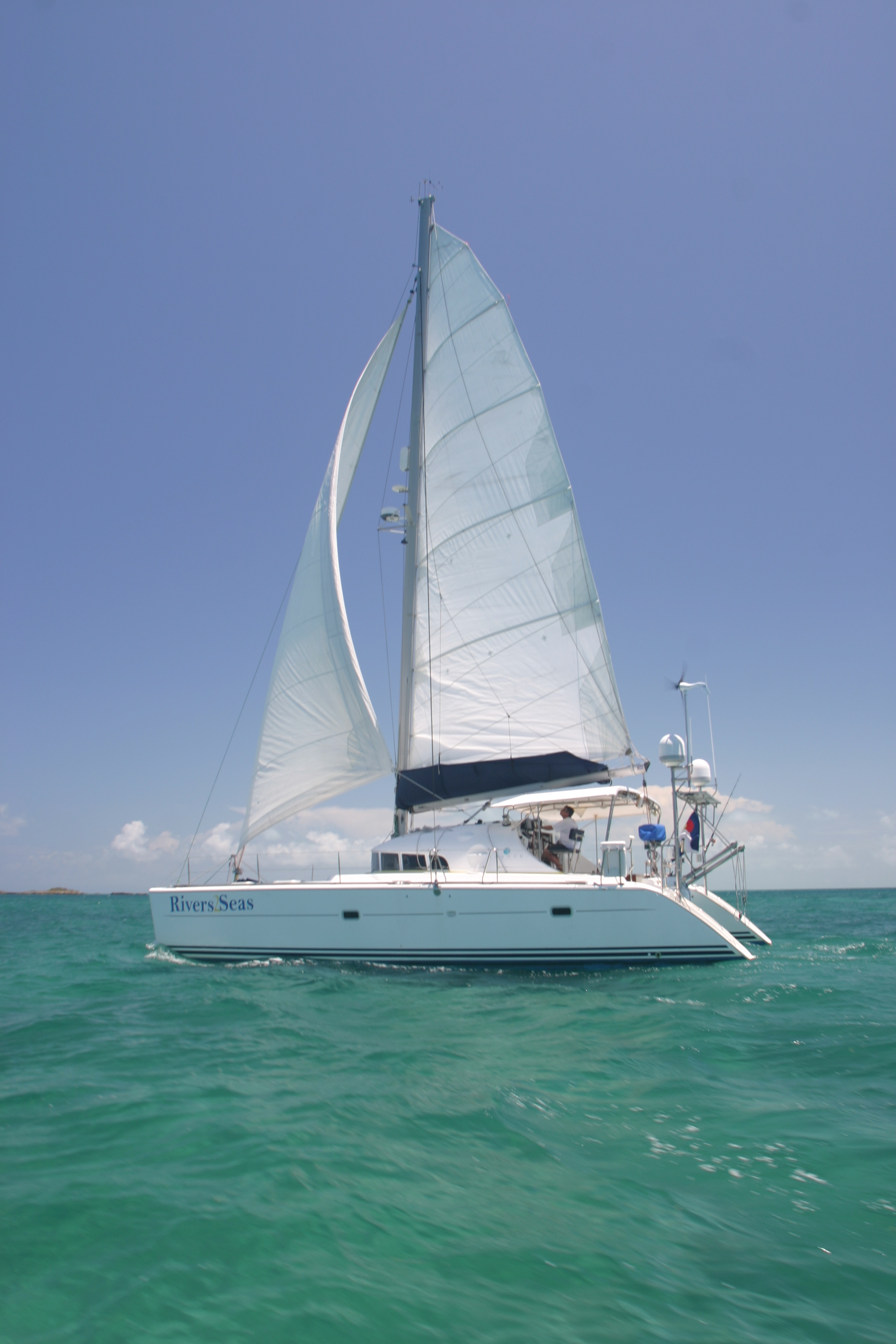 Looking up through the fog we see that planes are still landing at Fort Lauderdale International airport. It’s a good thing, as conditions on the sea have been deteriorating. Thunderheads shoot 35,000 feet towards the sky building an impressive wall. Soon they will darken to almost black. We are sailing aboard a 41’ catamaran, Rivers2Seas, so that I can get more experience before taking my family on an extended cruise. Winds have been building all day and are steady at 40 knots. A couple gusts have reached 50 knots. I’m getting the experience I wanted and an incredible dose of adrenaline. A plane about to land suddenly does a corkscrew back into the sky, screaming away from the thunderheads. Hmmmm. The fog thickens until we can only see a few hundred feet. Small hail comes with it, winds are howling, sea spray and rain pelt our faces. Tarn starts screaming, “This is living!” Tarn, who is normally a quiet guy, is ecstatic, glowing and just plain happy.